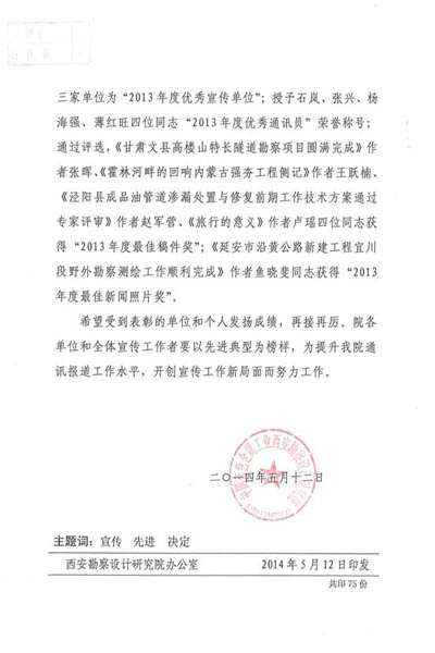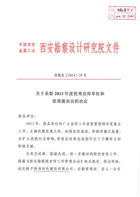 關于表彰2013年度優秀宣傳單位和優秀通訊員的決定